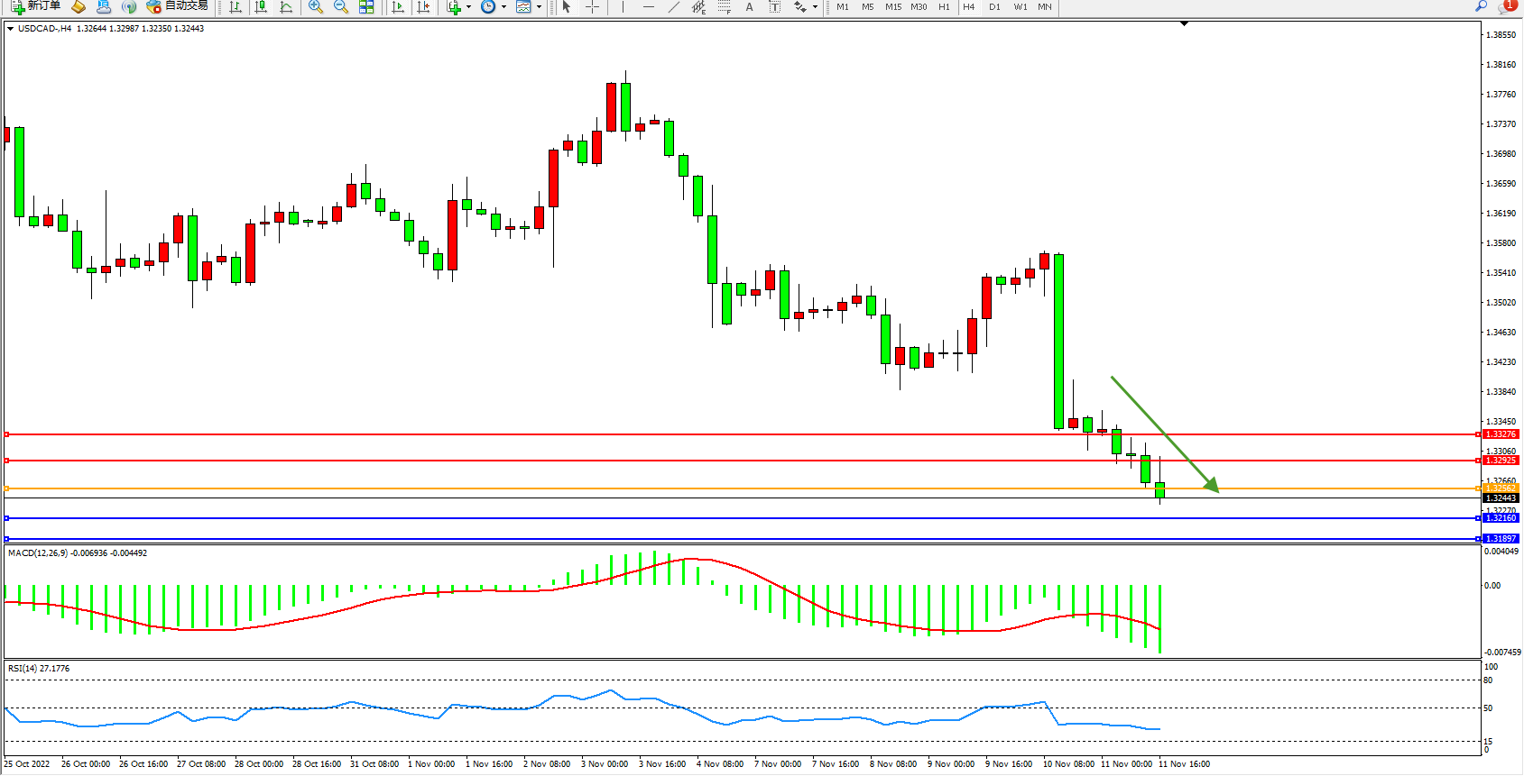 美元加元USDCAD——4小时K线图显示: