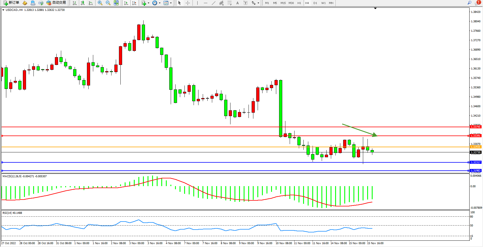 美元加元USDCAD——4小时K线图显示:
