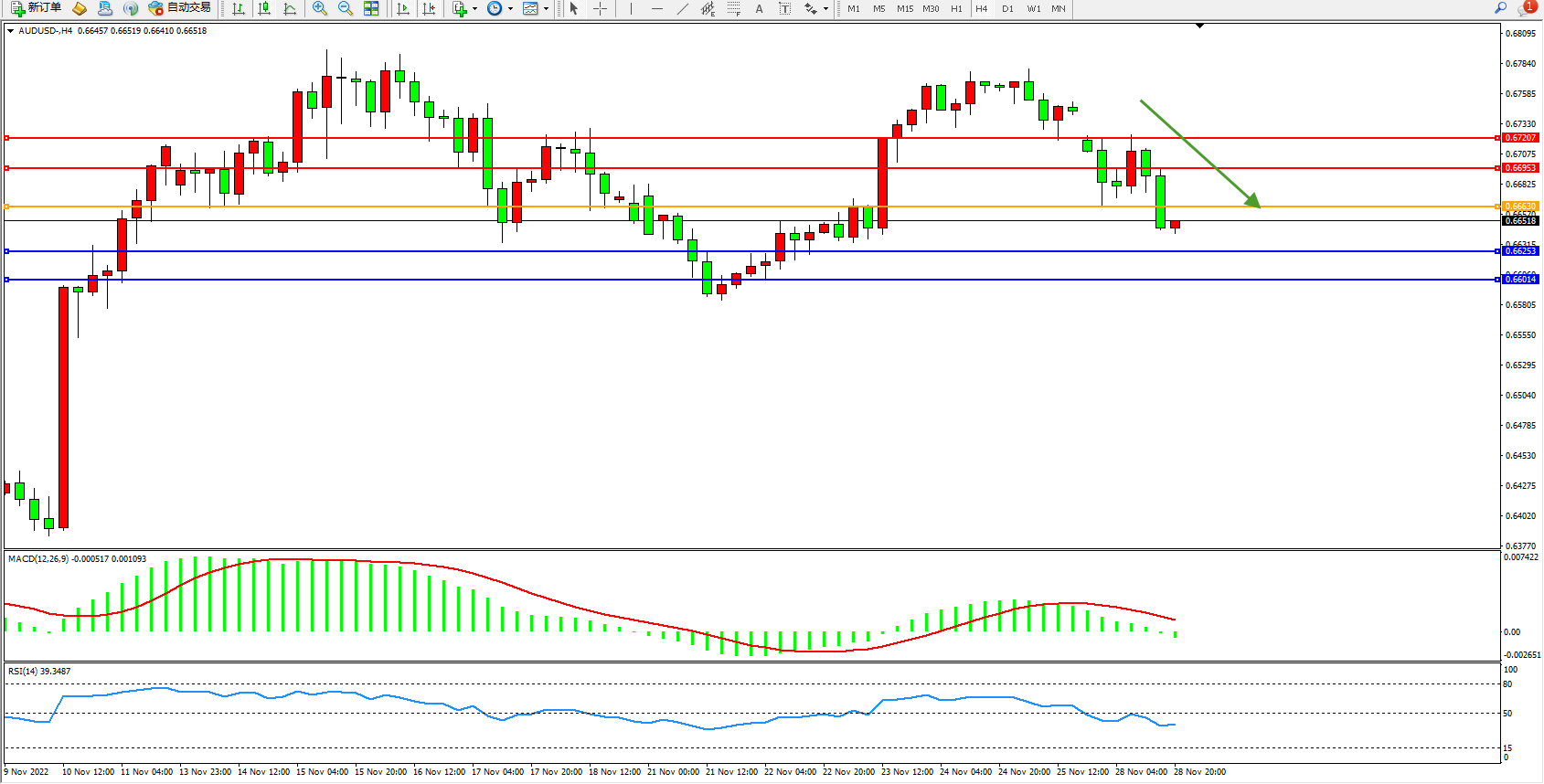 交易策略:0.66630下方看跌,目标0.66253、0.66014