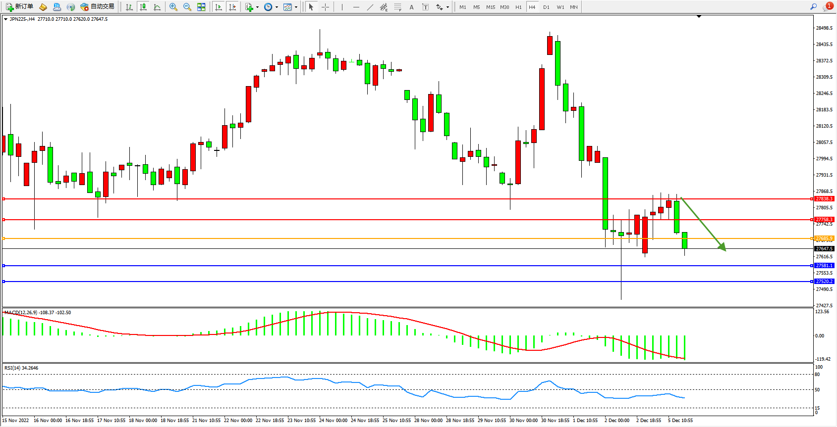 日经指数JPN225——4小时K线图显示: