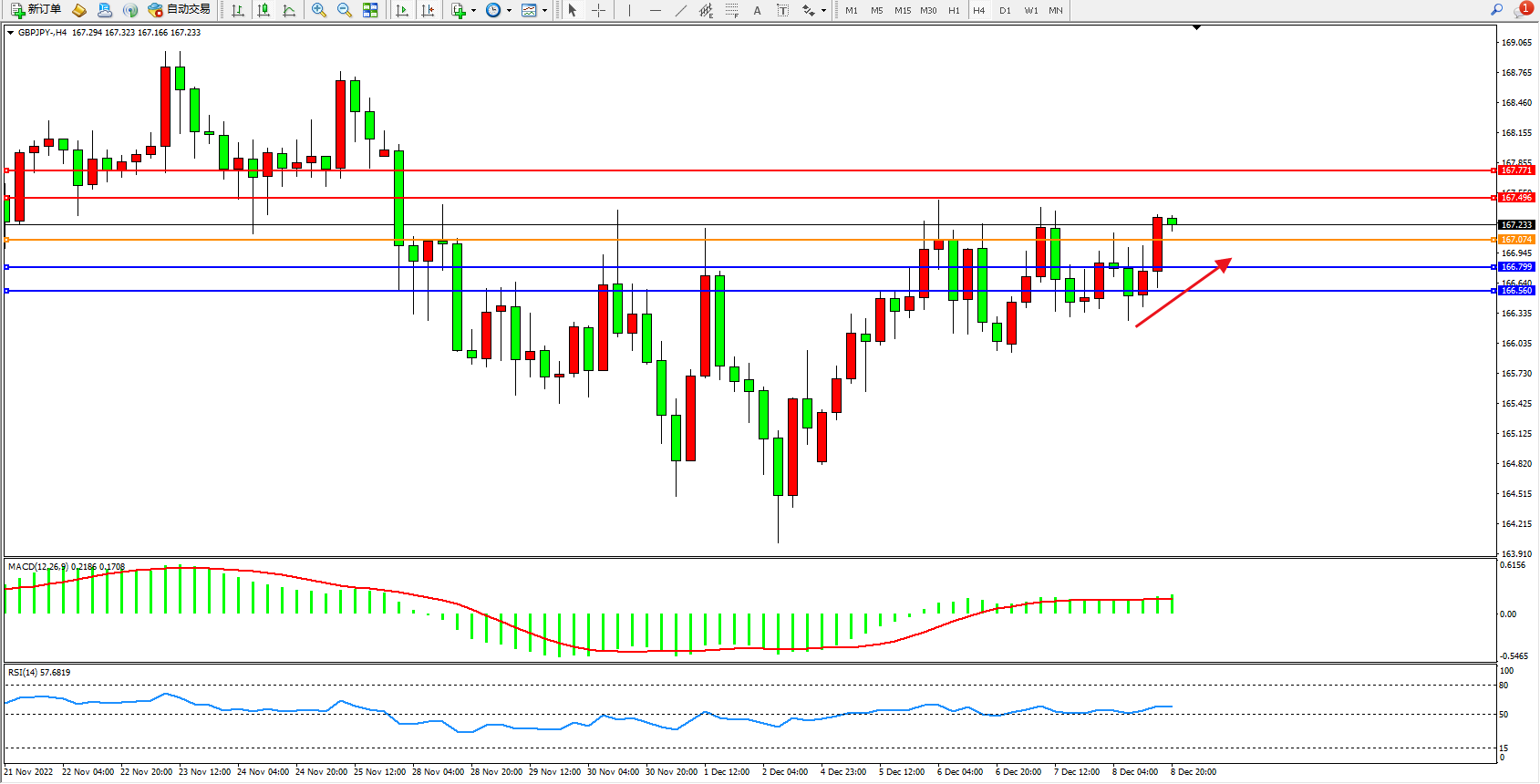 交易策略:167.074上方看涨,目标167.496、167.771
