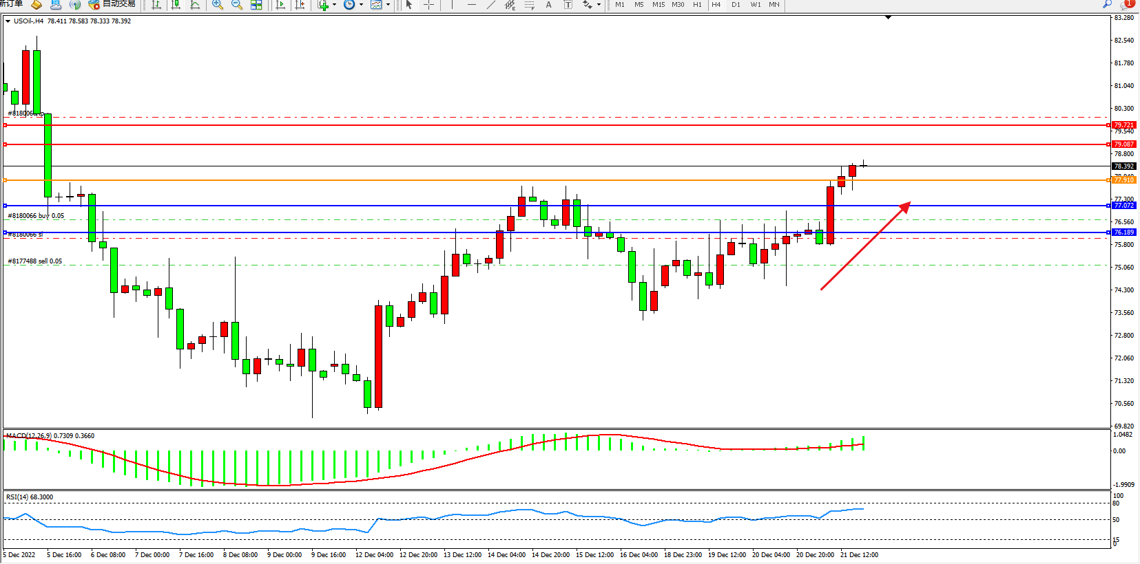 原油维持78.392附近震荡,美国EIA公布的数据显示,美国截至12月16日当周EIA原油库存变动实际公布减少589.40万桶,预期减少16.7桶,