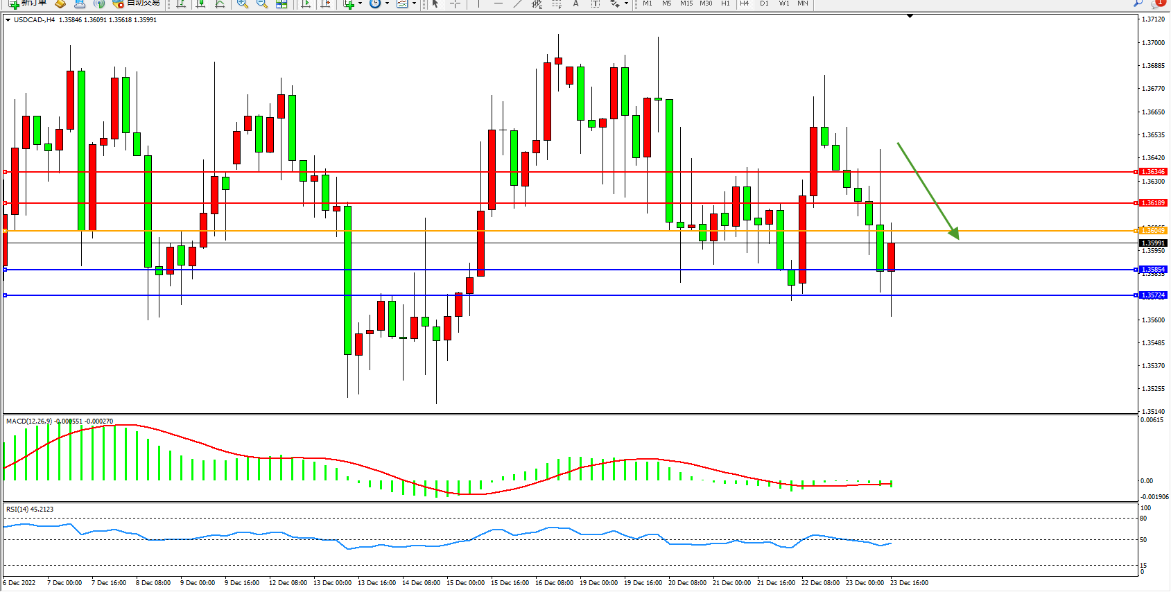 美元加元USDCAD——4小时K线图显示: