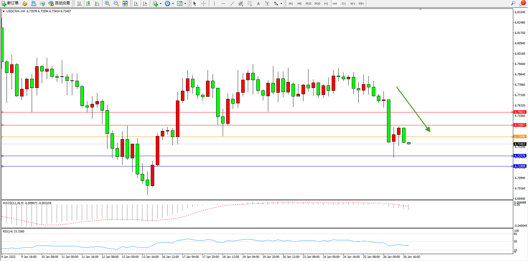 交易策略:6.73993下方看跌,目标6.72576、6.71808