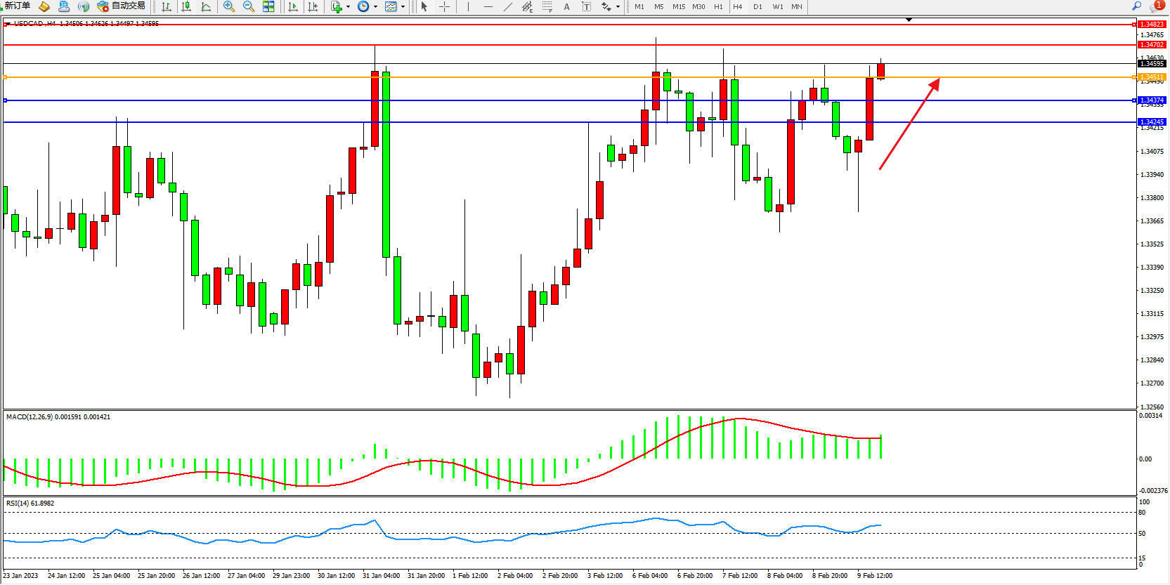 美元加元USDCAD——4小时K线图显示: