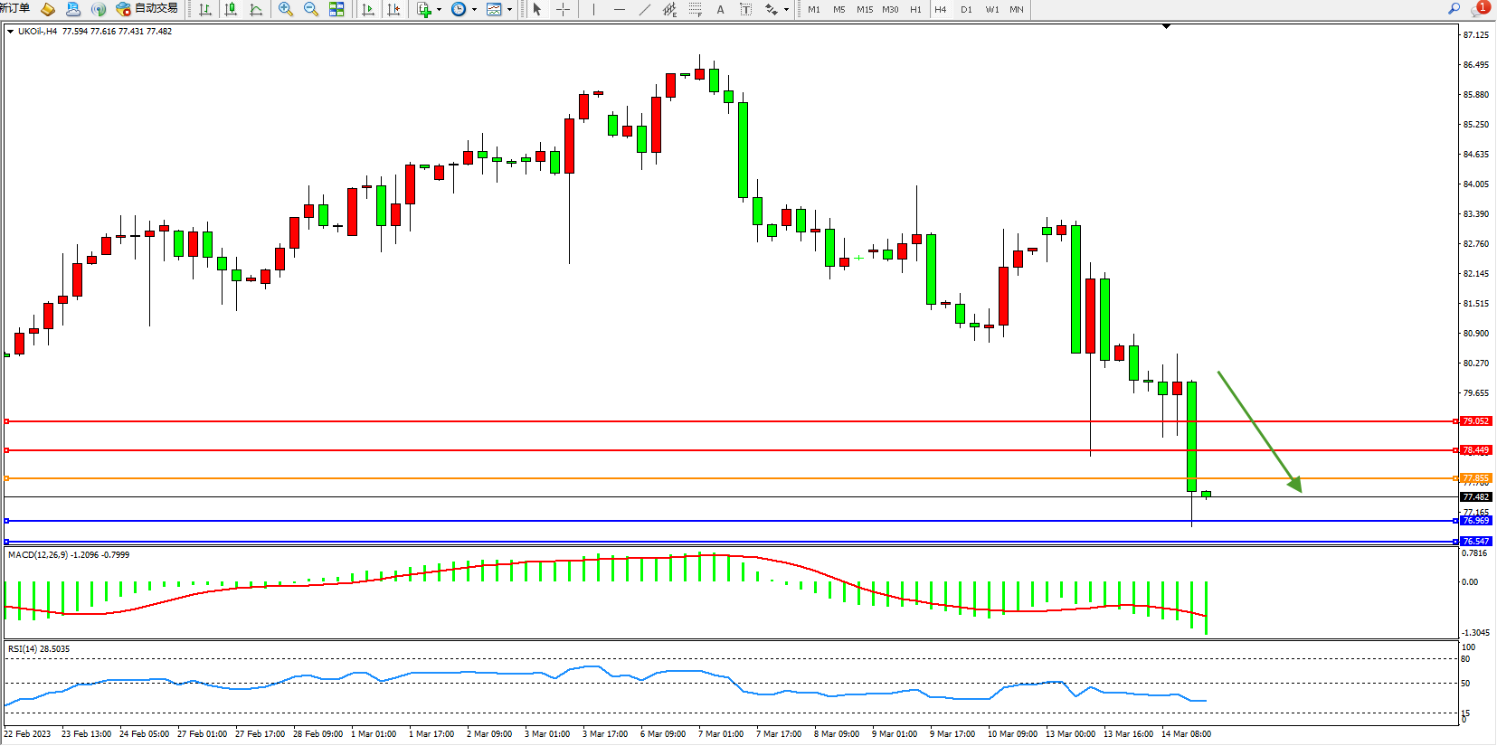 交易策略:77.855下方看跌,目标76.969 76.547