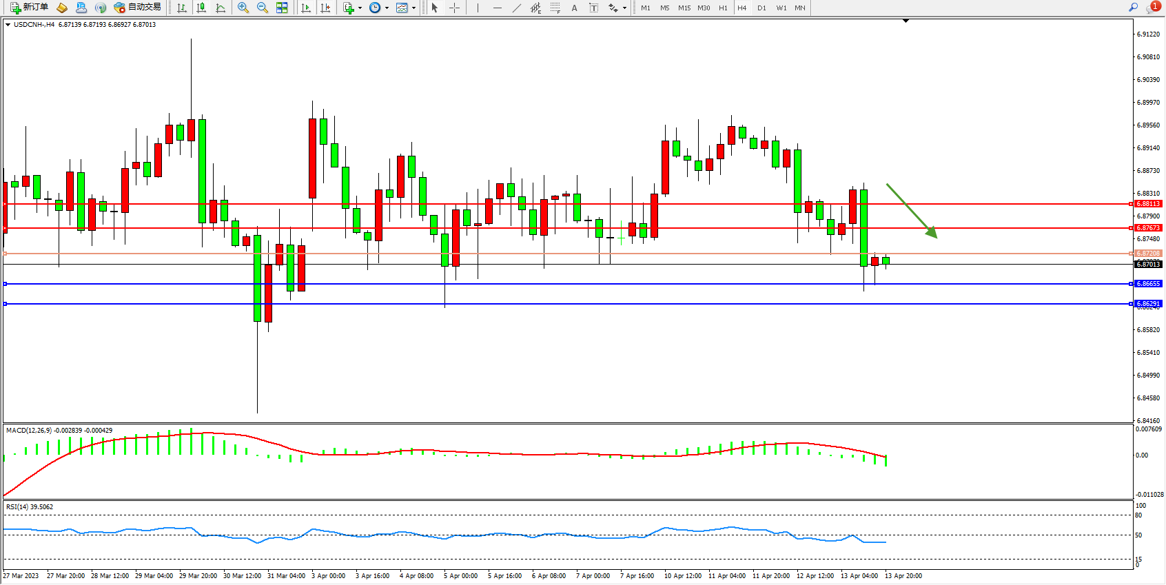 美元人民币USDCNH——4小时K线图显示: