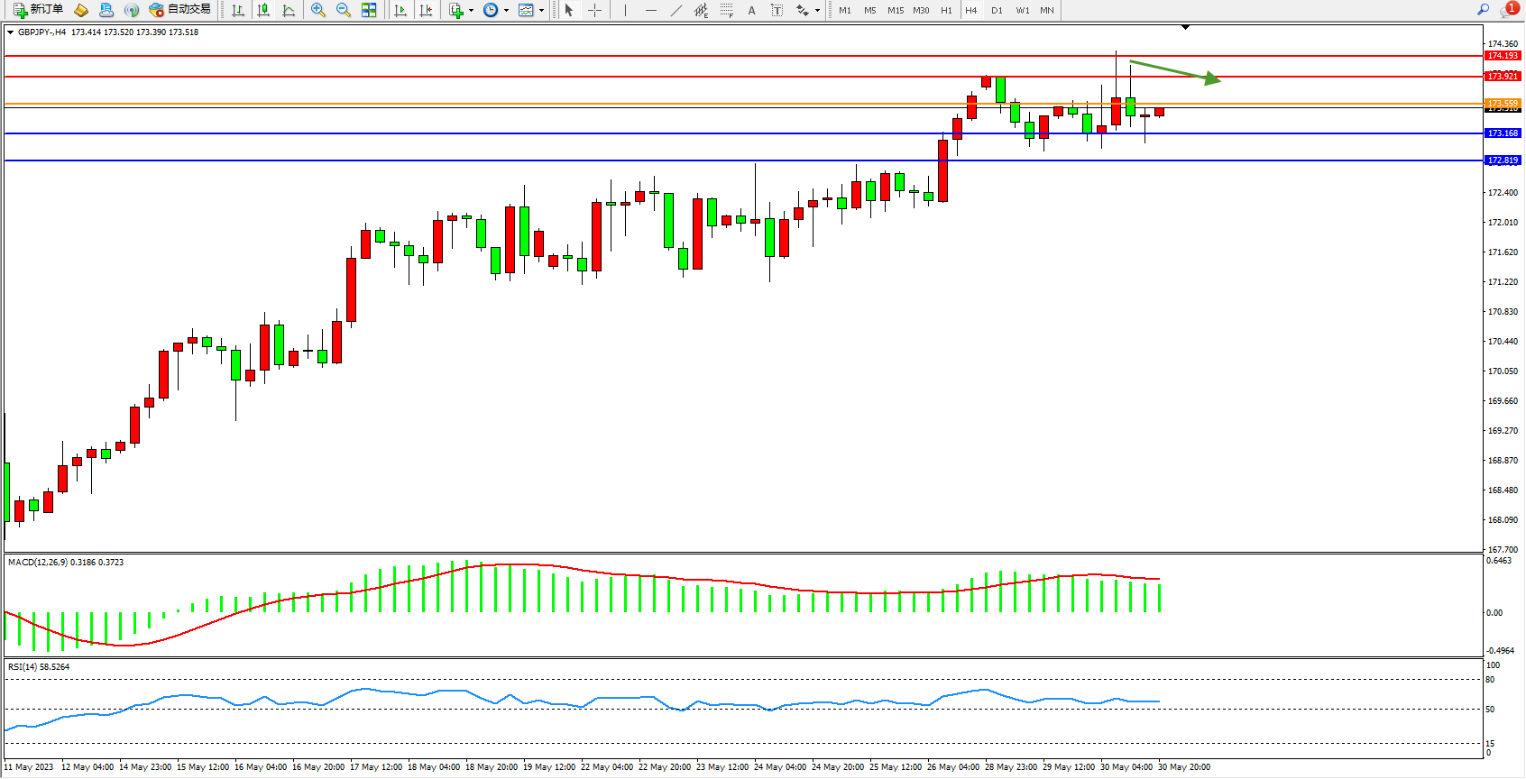 交易策略:173.559下方看跌,目标173.168  172.819