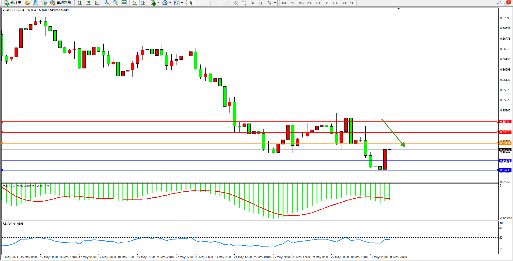交易策略:0.65151下方看跌,目标0.64875 0.64733