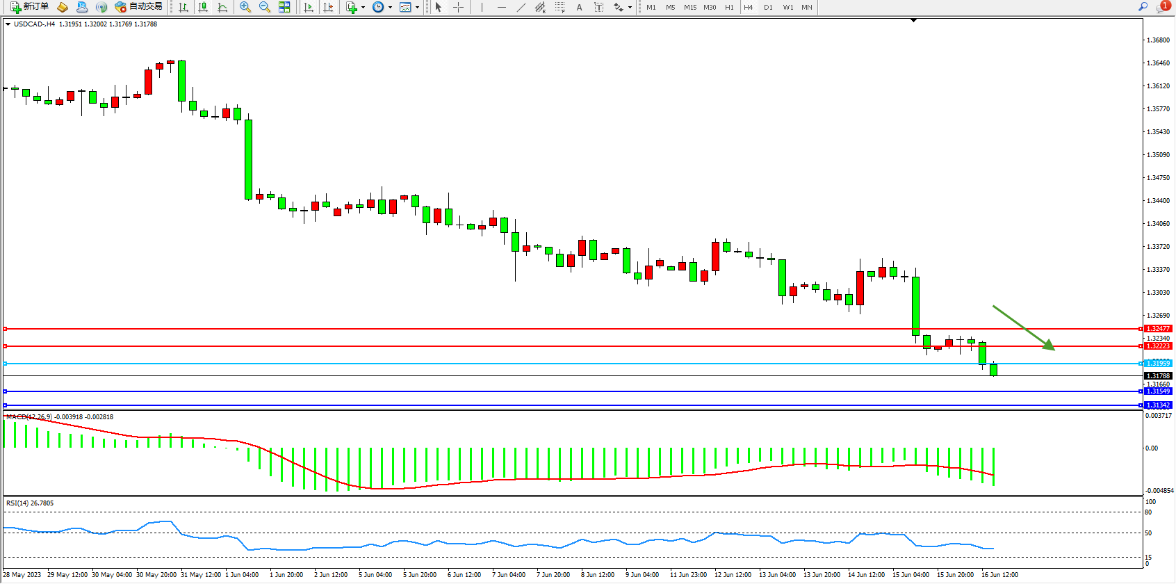 美元加元USDCAD——4小时K线图显示: