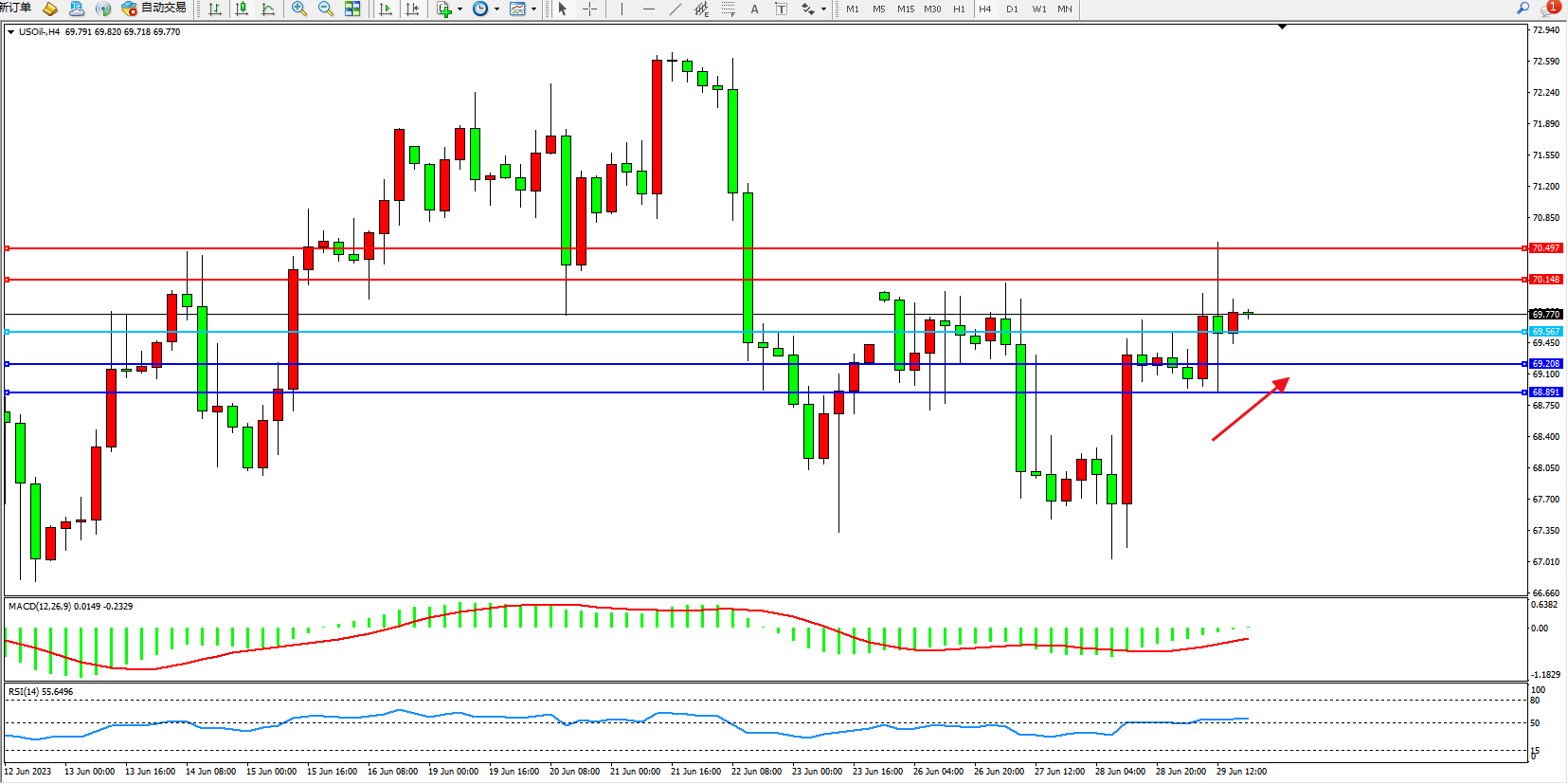 交易策略:69.567上方看涨,目标70.148 70.497