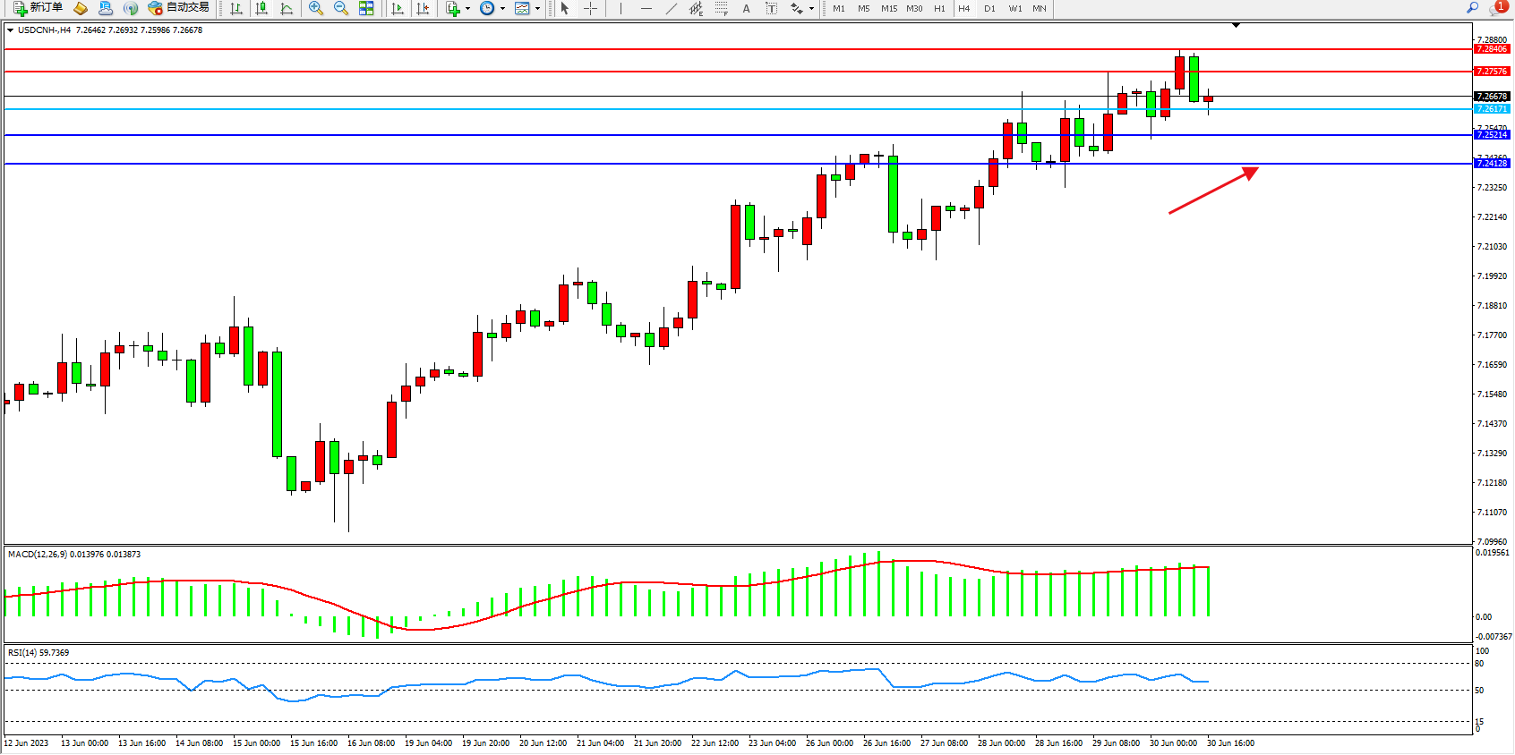 美元人民币USDCNH——4小时K线图显示: