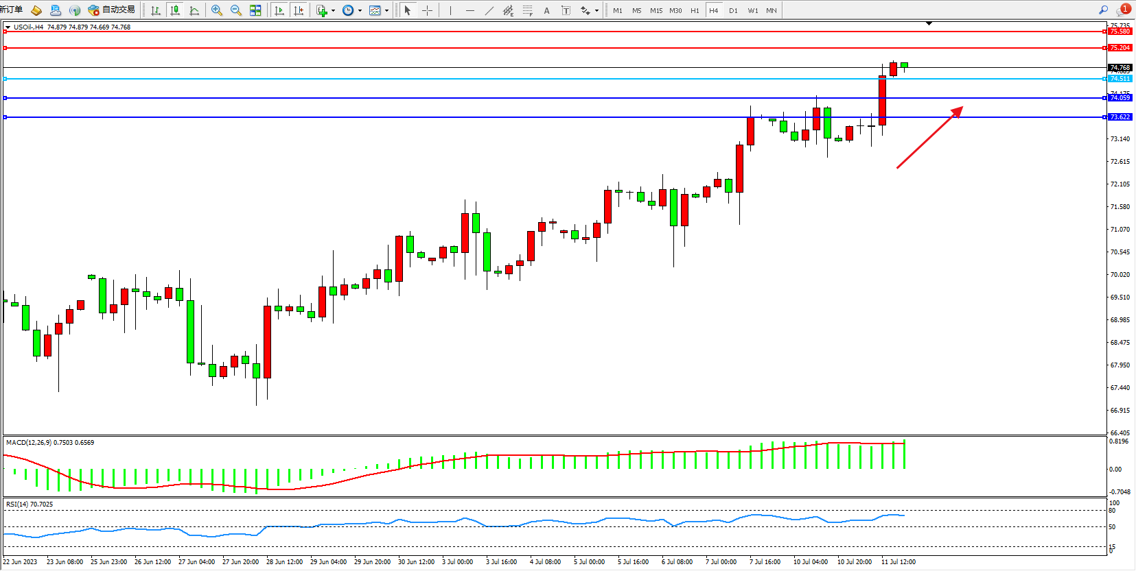 原油维持74.768附近震荡,全球经济低迷,但有中国等新兴经济体的石油需求依然强劲,并考虑OPEC+主要产油国减产,预计下半年市场可能会保持紧张。