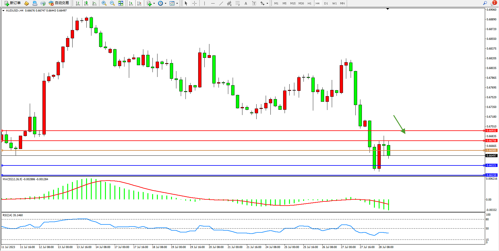 交易策略:0.66585下方看跌,目标0.66321 0.66150
