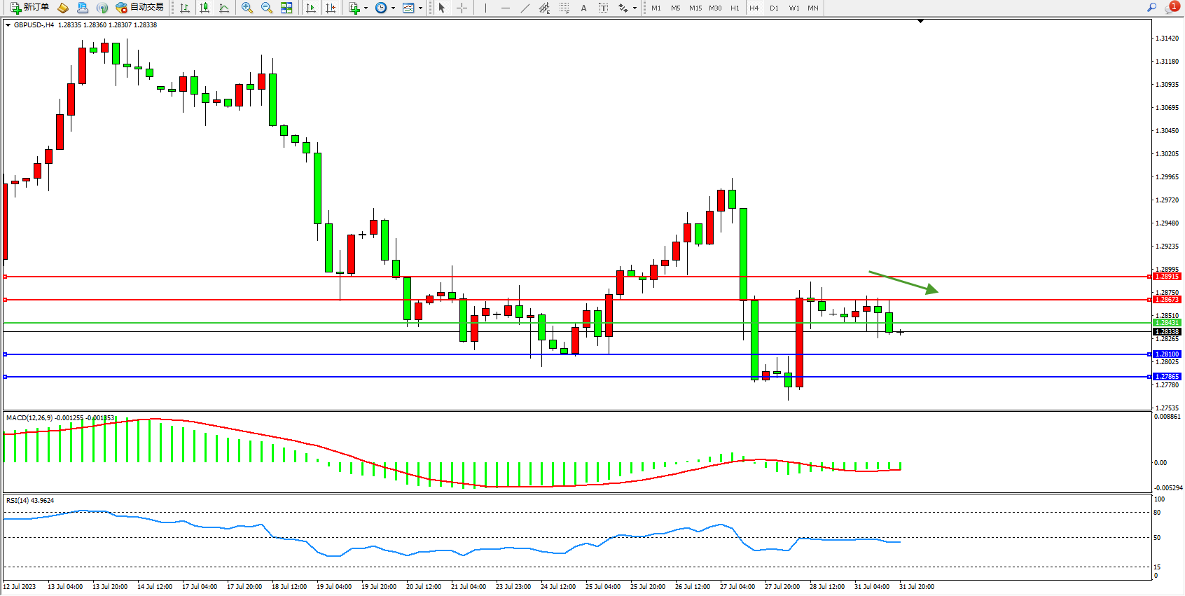 交易策略:1.28431下方看跌,目标1.28100  1.27865