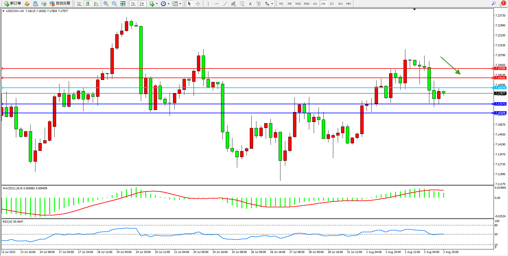 交易策略:7.18370下方看跌,目标7.17173 7.16508