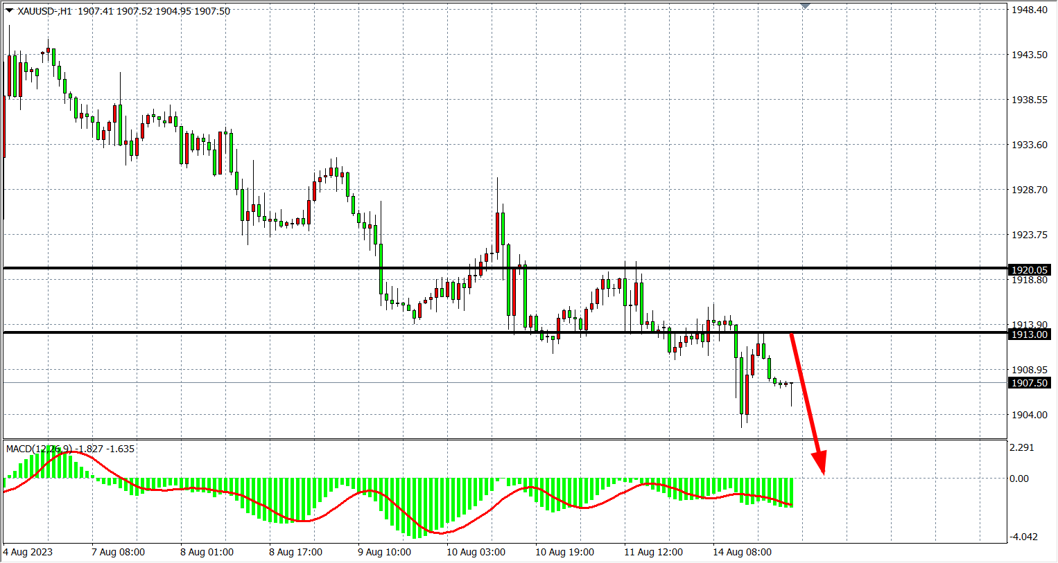 4小时图看,黄金进一步跌破1910关口,MACD量能延续零轴下,走势维持空头行情,阻力关注1913-1920附近,支撑关注1900-1880。
