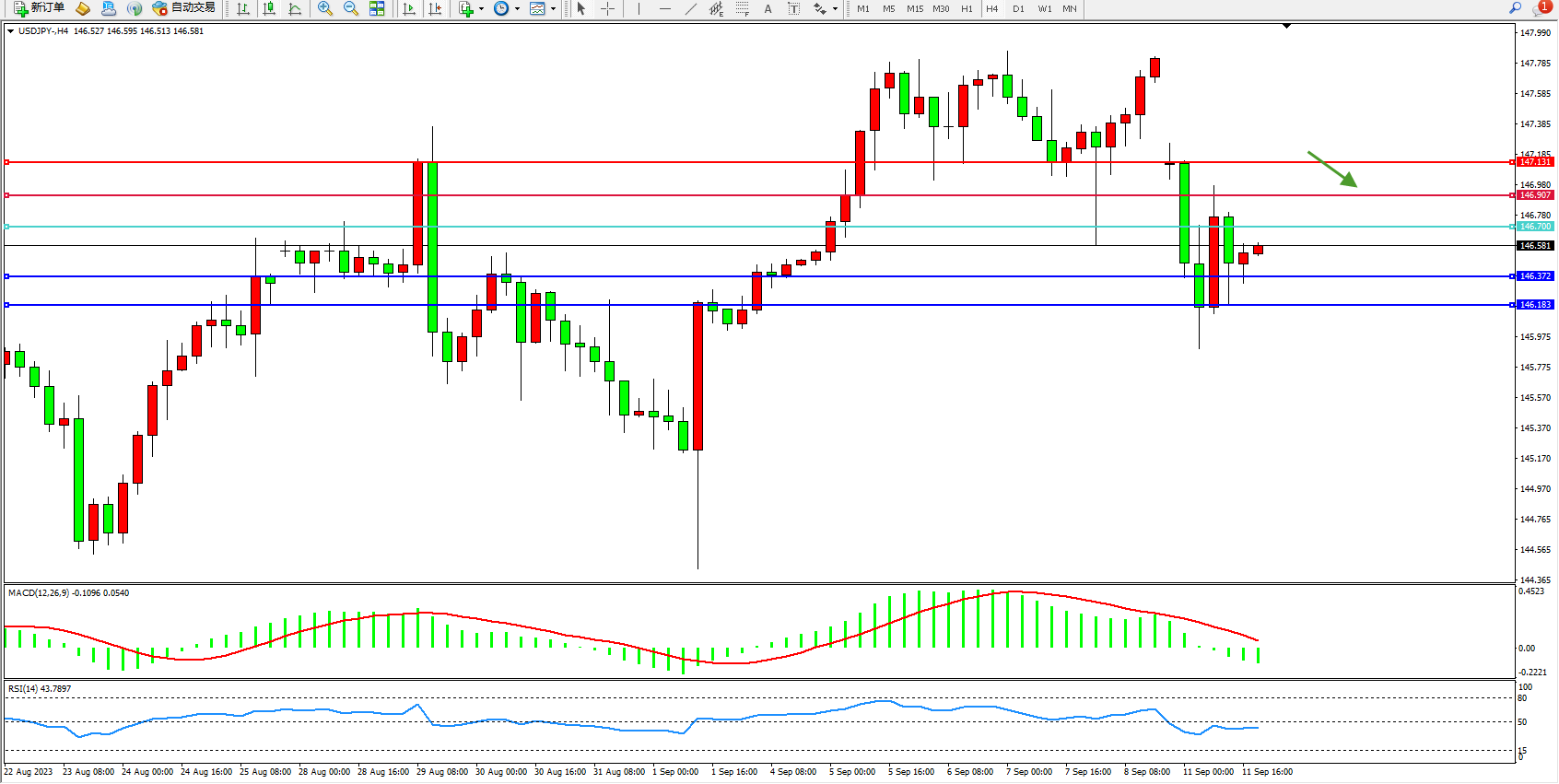 交易策略:146.700下方看跌,目标146.372 146.183