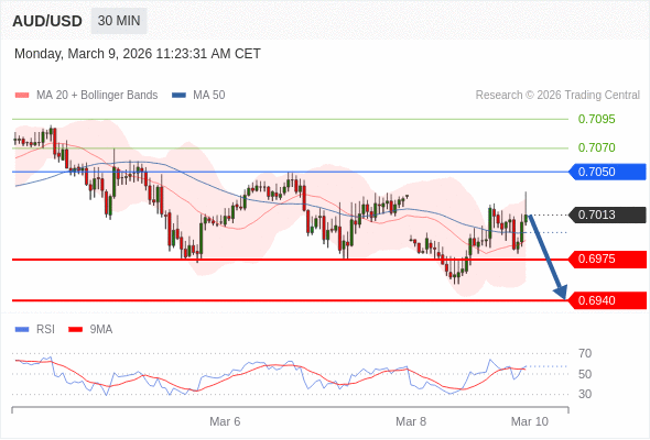 在 0.7050 之下,看跌,目标价位为 0.6975 ,然后为 0.6940 。