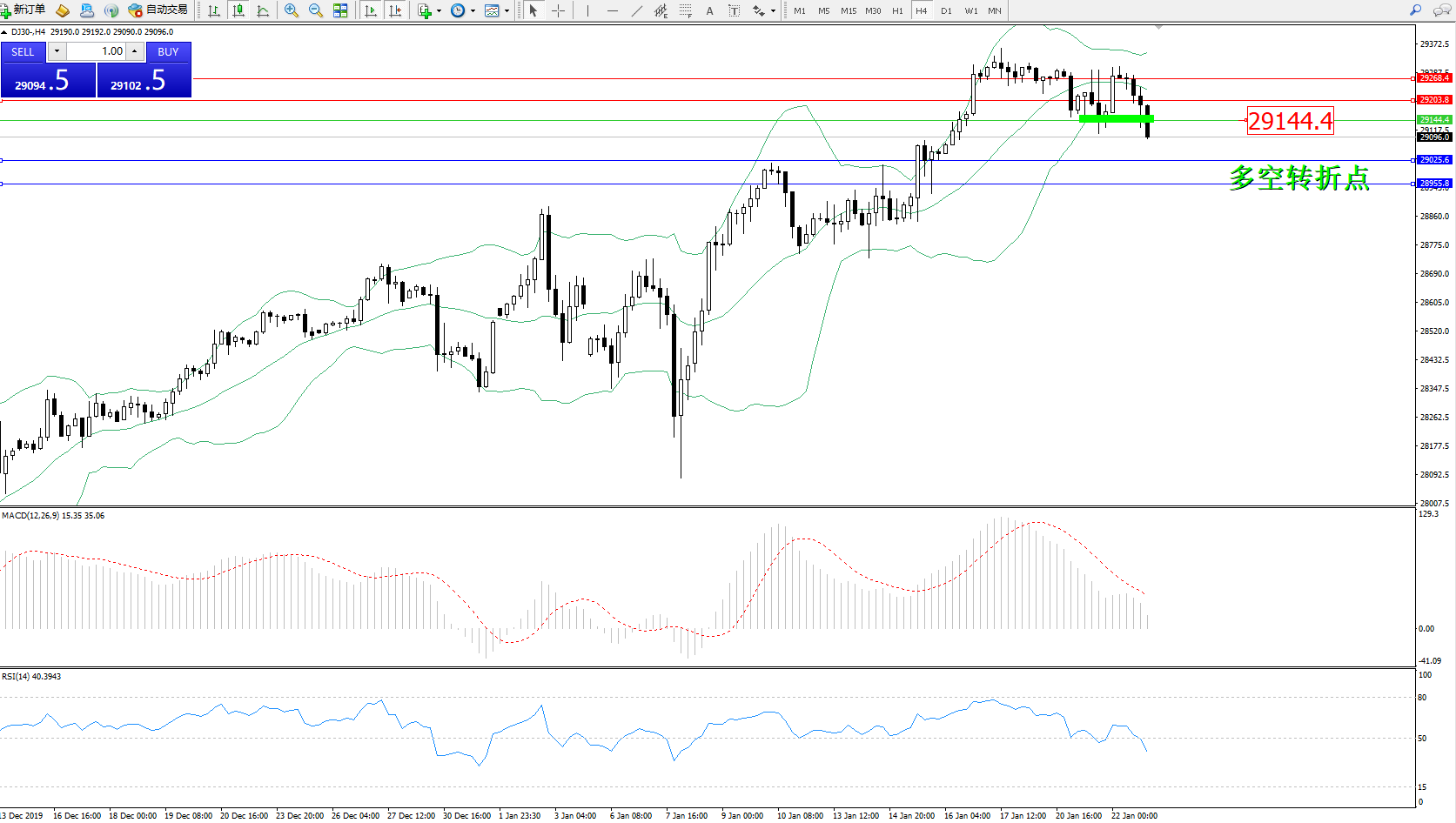 道琼斯指数DJ30—— 4小时K线图显示: