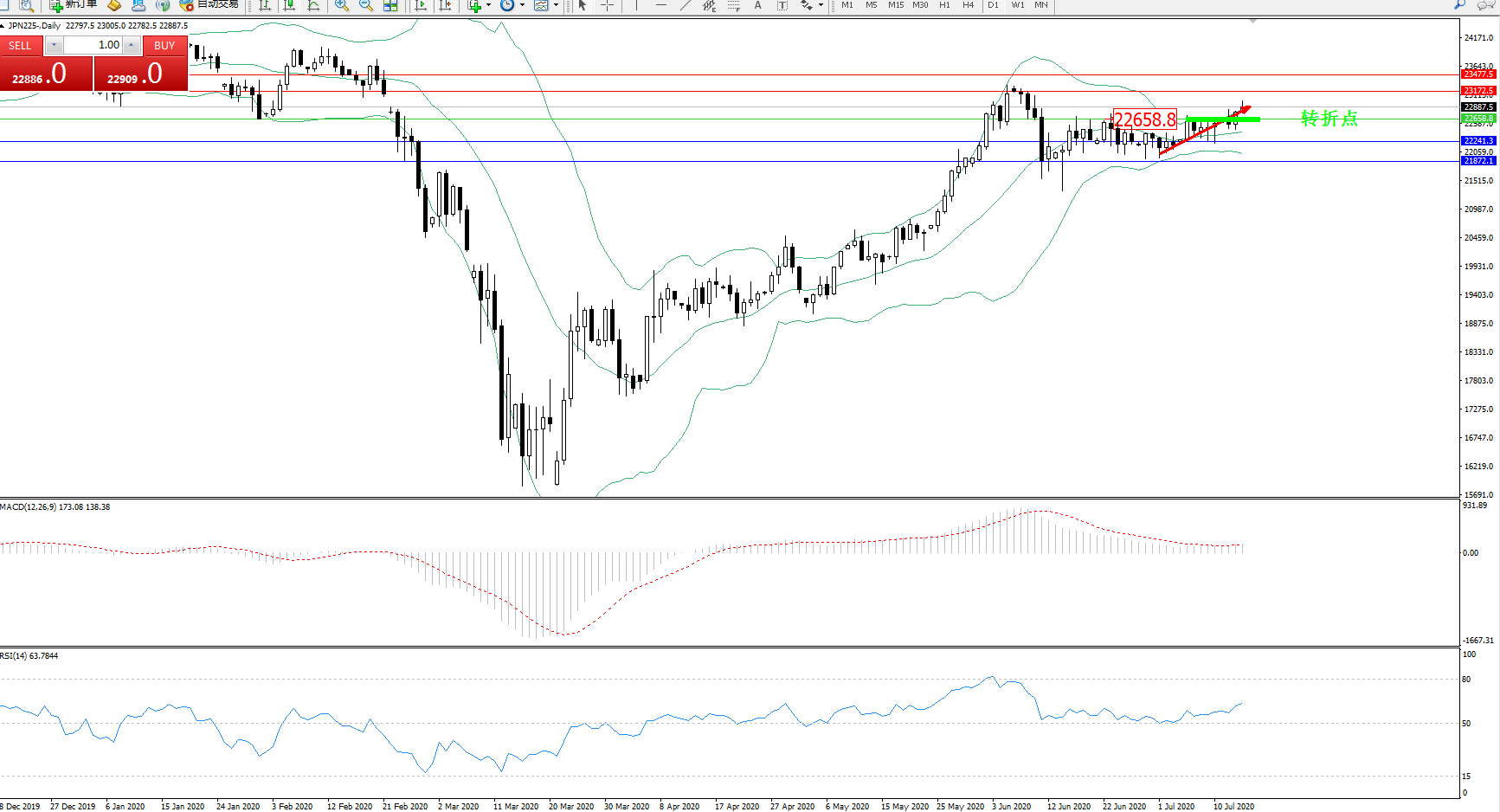 交易策略:22658上方看涨,目标23172、23477