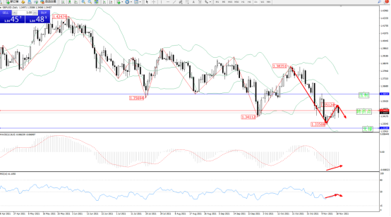 空头动力延续布林带指标通道中下轨区间持续震荡下行,低位抵达1.33508位置短暂整理回升,但整体下行趋势走势持续,短暂回升至1.35124位置后遇阻开始再度下行,布林带指标呈收口走势持续下行,关注中轨附近节点,上方压制关注1.36014位置,低位支撑关注1.33184位置,关注1.34652附近转折点,MACD指标处于空头区域低位整理缓慢回升,RSI指标处于空头区域弱势整理上移后再度向下移动,如图: