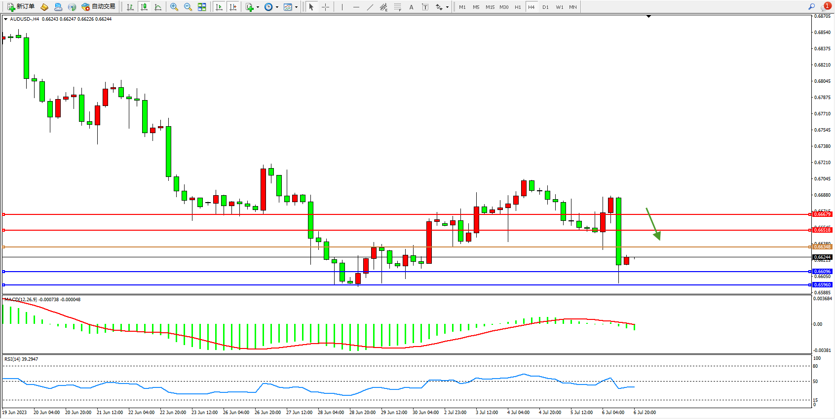 澳元美元AUDUSD——4小时K线图显示: