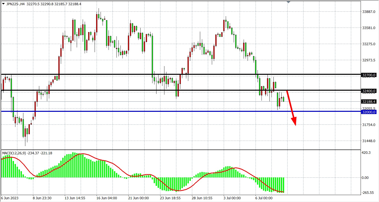 4小时图看,日经指数在32400之下走弱,MACD量能在零轴下继续放量,空头行情延续,阻力关注32400-32700,支撑关注32000-31700。