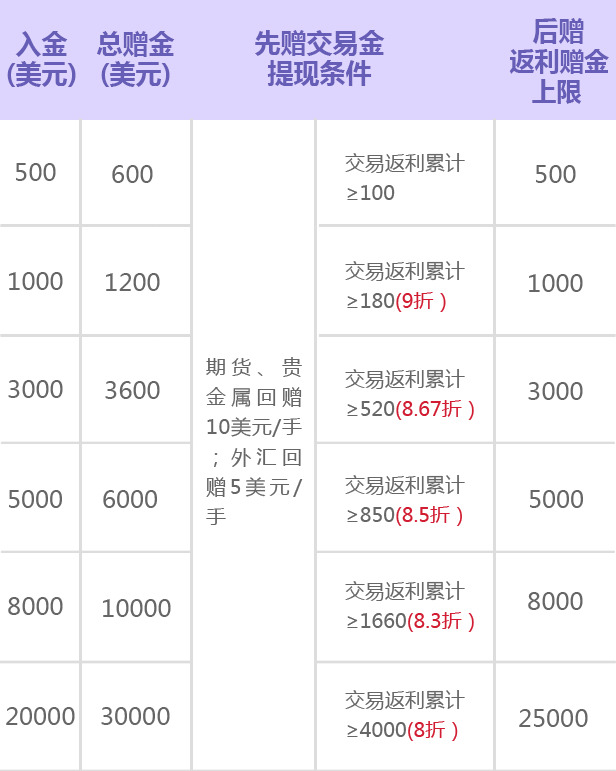 1000美元≤当月淨入金<3000美元的参与用户,累计完成交易返利赠金为180美元或以上方可转为账户净值提现,继续交易,可再获得1000美元返利金;当当月淨入金≥3000美元的参与用户,累计完成交易返利赠金为520美元或以上方可转为账户净值提现,继续交易,可再获得3000美元返利金;当当月淨入金≥5000美元的参与用户,累计完成交易返利赠金为850美元或以上方可转为账户净值提现,继续交易,可再获得5000美元返利金;当当月淨入金≥8000美元的参与用户,累计完成交易返利赠金为1660美元或以上方可转为账户净值提现,继续交易,可再获得8000美元返利金。当当月淨入金≥20000美元的参与用户,累计完成交易返利赠金为4000美元或以上方可转为账户净值提现,继续交易,可再获得25000美元返利金;
